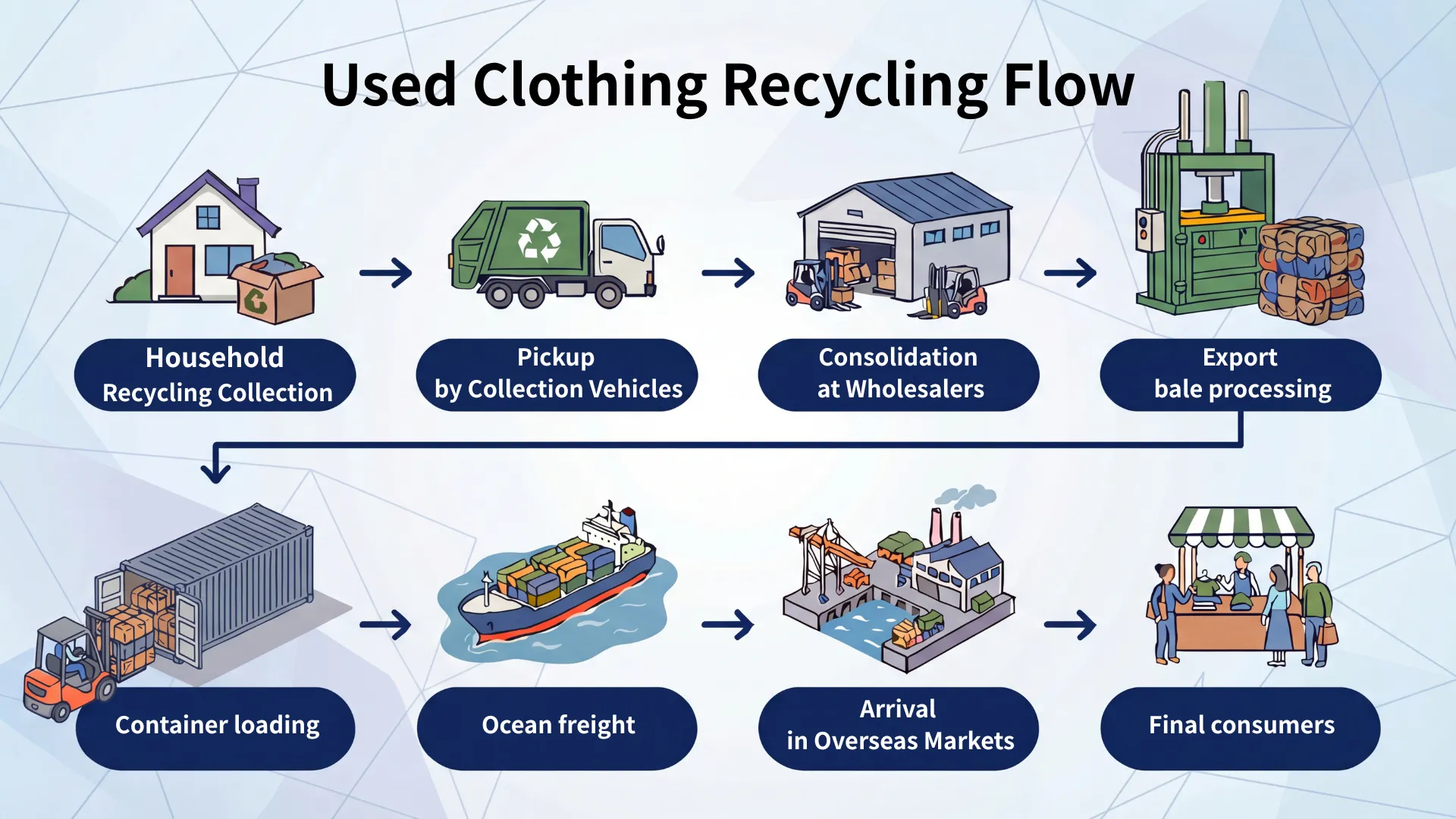 Based in Japan, we supply used clothing materials to markets in Asia and worldwide.